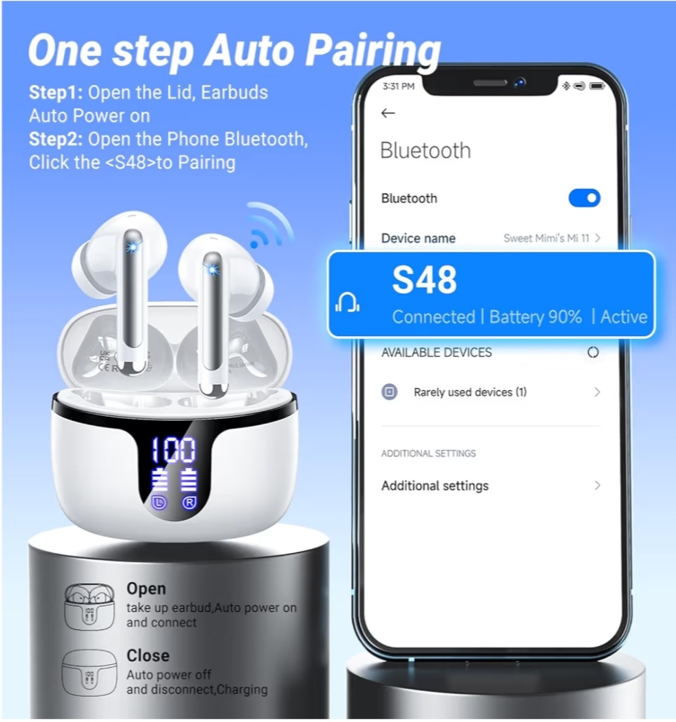 S48 Wireless Earbuds Bluetooth 5.4 Headphones 42h Duration Playback for running/fitness/office use. Equipped with 4 noise cancelling microphones, IPX7 waterproof and LDE battery display screen HiFi-Level Immersive Sound ENC Noise-Cancelling Calls:The Monyhigh S48 wireless ear buds are equipped with advanced HiFi stereo, delivering crisp high notes, rich mid-range notes, and deep bass, creating an immersive music atmosphere and showcasing studio level sound quality. Upgrading the ENC microphone can effectively filter background noise, even in noisy environments such as busy streets or buses, the call sound is still clear and loud, and communication is not disturbed.